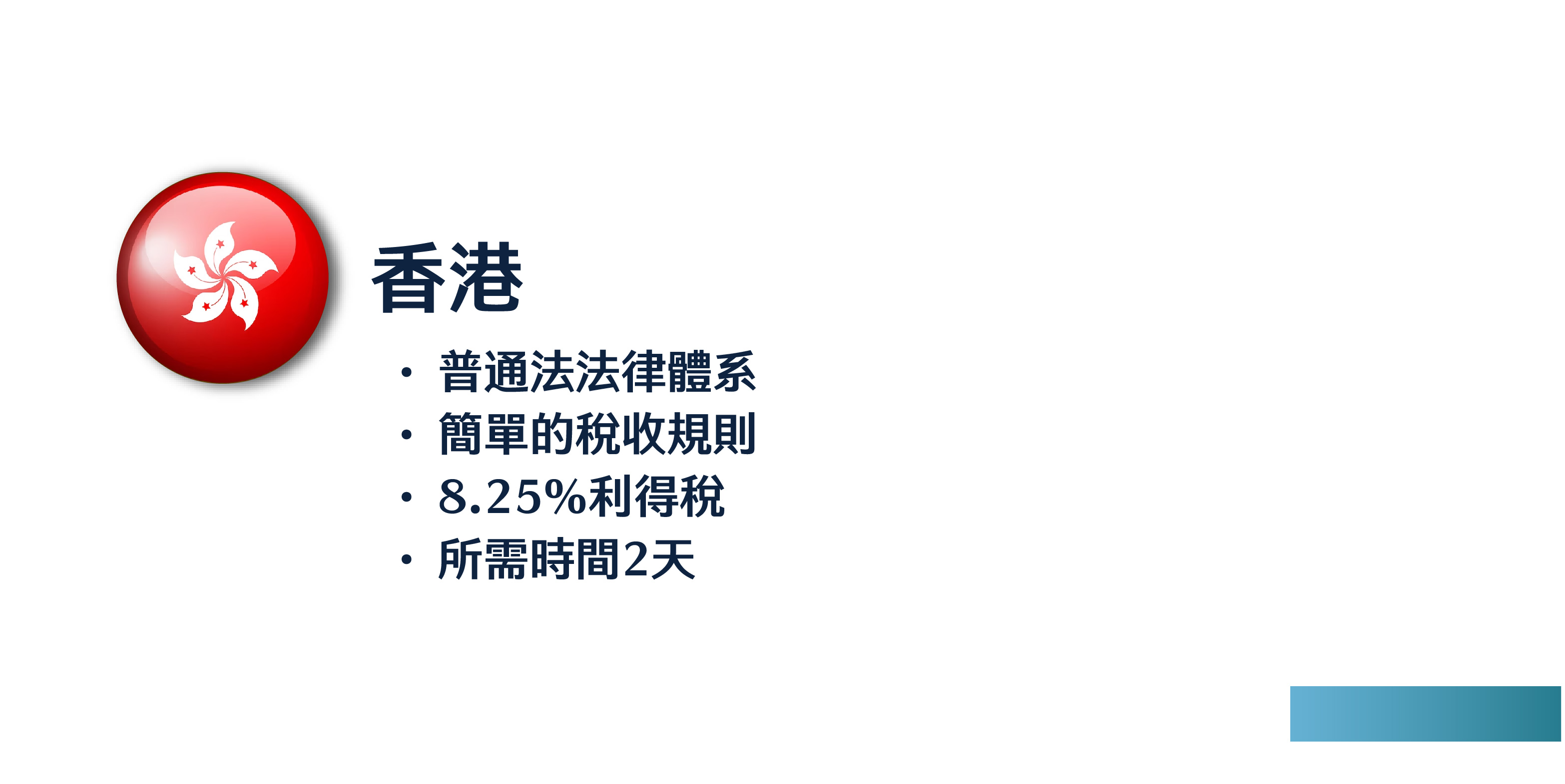 香港是世界上最開放的經濟體之一,稅制簡單且可預計。 透過香港有限公司,企業家可以享受免於商業債務的個人責任的保護,獲得更好的商業活動融資,透過出售股份簡單地轉讓企業股權,抵利得稅率以及與多國的稅務協議,可非常有效地管理稅務風險。