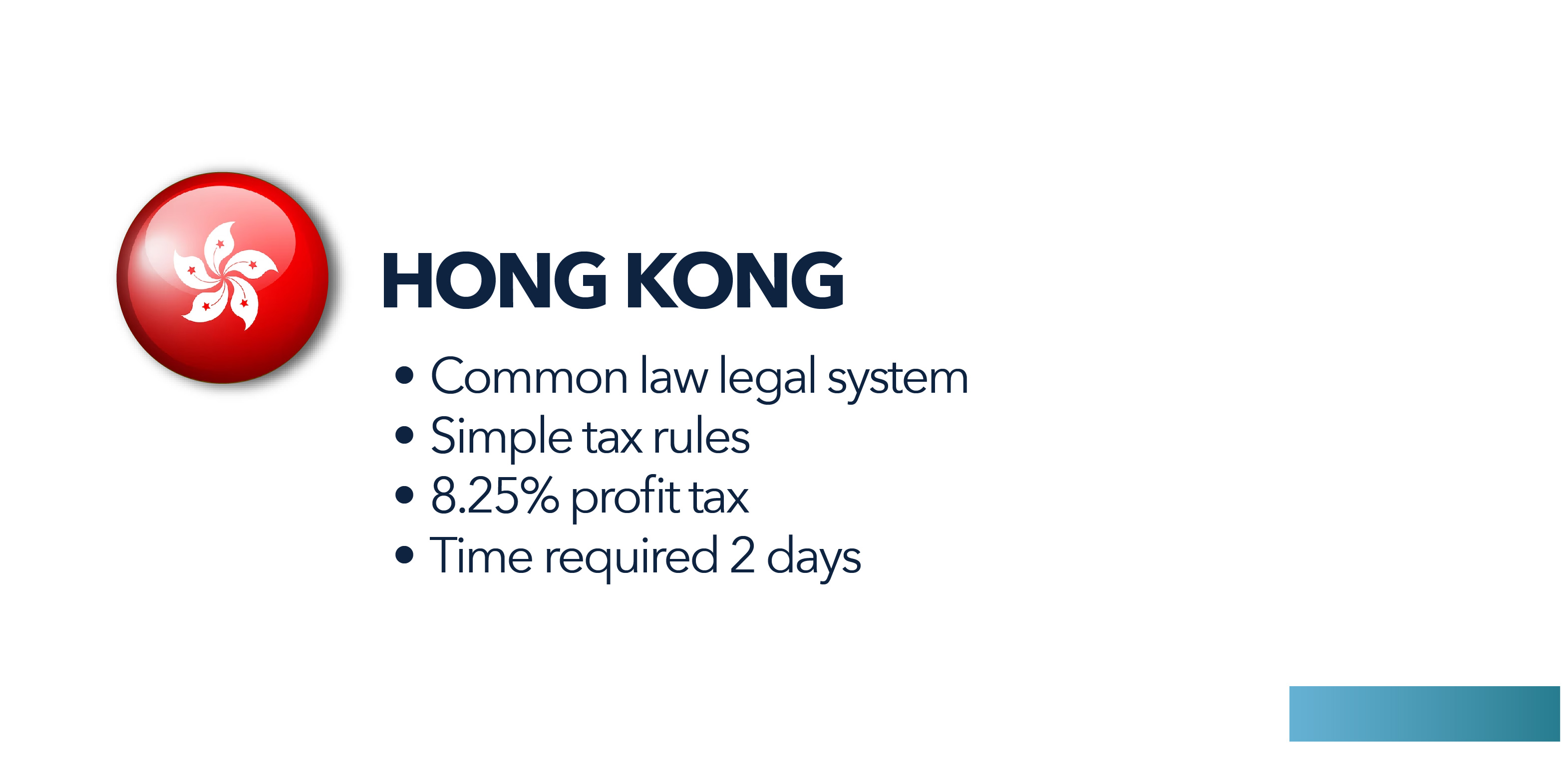 Hong Kong is one of the most open economies in the world, and the tax regime is simple and predictable. With a HK limited company, business owners may enjoy protection from personal liability for business debts, better access to financing for business activities, simple transfer of business ownership through the disposal of shares and more efficient tax risk management through access to corporation tax rates and international tax treaties.